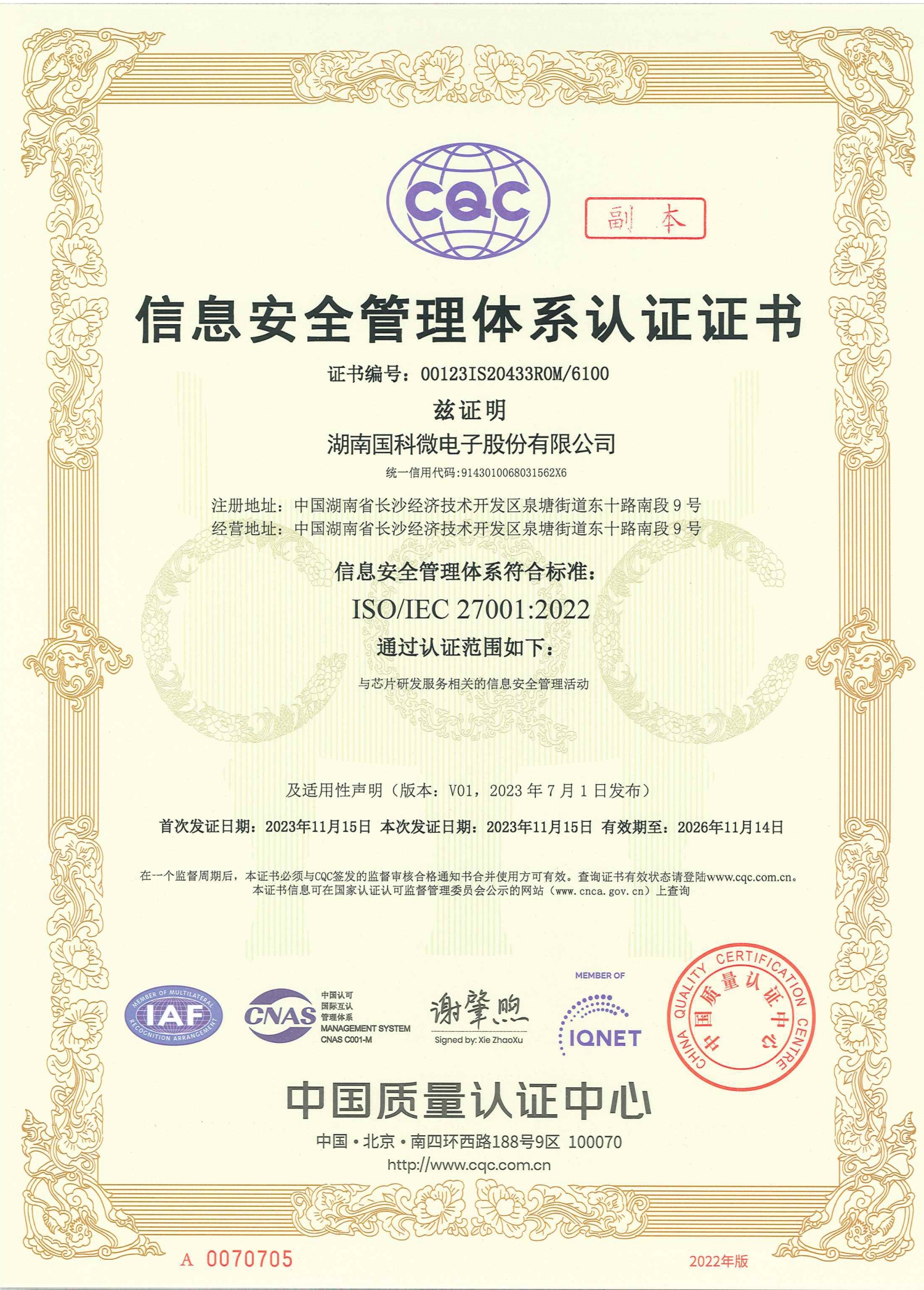信息清静管理系统认证证书